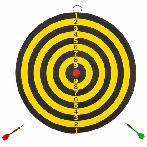 Bersaglio double face con freccette a punta metallica incluse per il tiro a segno. Dotato di gancio da parete in metallo, riceverete due giochi in uno, infatti: una facciata monta una rete metallica divisoria dei settori , l’altra è con il gioco classico ad anelli.