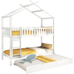 Letto A Castello Per Bambini 90x200cm Con Scaletta E Tetto Legno Di Pino – Bianco