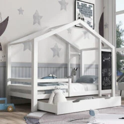 Letto Per Bambini 90 X 200 Cm Con Lavagna E 2 Cassetti, Struttura A Doghe In Legno Massello, Bianco