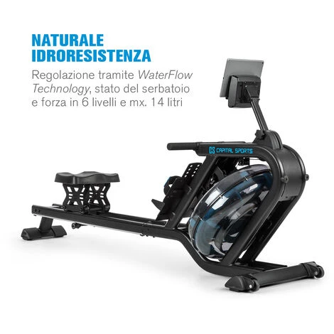 Il vogatore Flow M2 di Capital Sports ti promette un’esperienza di allenamento casalinga assolutamente unica. Al centro dell’allenamento incredibilmente uniforme e delicato sulle articolazioni si trova il grande serbatoio, che con la pagaia ergonomica assicura un esercizio estremamente naturale – quasi come se ti trovassi effettivamente a remare su un lago. Come in una barca a remi, la resistenza dell’allenamento è regolata dall’acqua e dal proprio sforzo: WaterFlow Technology – più alto è il livello di riempimento del serbatoio, maggiore è la resistenza, come se stessi immergendo i remi il più a fondo possibile. Allo stesso modo, la resistenza aumenta con la forza di vogata esercitata. Ulteriori vantaggi della resistenza ad acqua sono l’allenamento silenzioso con la tipica colonna sonora naturale del canottaggio e l’assoluta mancanza di usura: l’acqua non si logora! Per facilitare la regolazione della resistenza, nel serbatoio da max. 14 litri sono già segnati 6 livelli. Per tenere sotto controllo il tuo allenamento, il vogatore Flow M2 di Capital Sports ha un mini-computer con schermo LCD sul quale potrai visualizzare la tua performance, la distanza percorsa o le calorie bruciate, ma anche le vogate al minuto o la frequenza cardiaca.