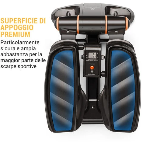 Sul display LCD del computer di allenamento potrete tenere sotto controllo i dati delle vostre prestazioni, come consumo calorico o passi al minuto, mentre un timer calcola il tempo di esercizio che desiderate. Inoltre, con la app gratuita FitShow è possibile documentare, salvare e condividere i successi raggiunti nell’allenamento. Il Shock-Absorbing-System idraulico e le grandi superfici di appoggio per i piedi premium con rivestimento in gomma garantiscono un movimento sicuro, protetto da colpi, in modo da tutelare articolazioni e tendini. Le ampie superfici di appoggio per i piedi e la struttura robusta rendono il ministepper Galaxy Step perfetto per ogni tipo di scarpa da allenamento e per persone fino a 120 kg di peso.