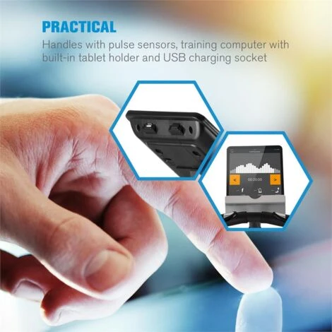 Il porta tablet integrato nel manico aiuta contro la noia sulla cyclette. Smartphone, Tablet o eReader trovano qui lo spazio perfetto e possono essere utilizzati sia per utilizzare l’applicazione Kinomap o semplicemente per guardare film, ascoltare musica o leggere durante l’allenamento. Una porta di ricarica USB nel computer di allenamento garantisce una formazione ininterrotta. Se al momento non si dispone di uno SmartDevice, è possibile monitorare i valori dell’allenamento sulla cyclette Helix Pro in modo convenzionale tramite il computer di allenamento integrato. Oltre alla distanza percorsa, al tempo di allenamento e al consumo calorico, mostra direttamente il polso grazie ai sensori manuali integrati. Infine, ma non meno importante, il sistema SilentBelt, estremamente silenzioso, garantisce che il vostro allenamento non dia fastidio a nessuno.