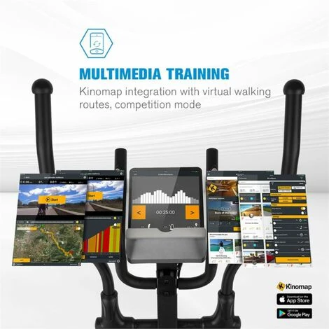 Benvenuti nel 21° secolo: oggi l’allenamento deve essere multimediale e connettivo. Per raggiungere questo obiettivo, il crosstrainer Helix Track di CAPITAL SPORTS si basa sulla piena integrazione dell’app Kinomap. Non solo consente l’accesso a più di 100.000 km di giri in bicicletta, ma è anche collegato direttamente alla bici tramite Bluetooth come sistema di feedback: i vostri dati sulle prestazioni, come velocità, frequenza cardiaca o distanza coperta trasferiti all’app e valutati, controllano direttamente anche la corsa virtuale. Se il tour selezionato è in salita, la resistenza del crosstrainer viene regolata automaticamente come se stesse guidando in salita. Quindi potete, ad esempio, sperimentare il tour sulle alpi senza dover allontanarvi dal vostro appartamento. E se non è abbastanza, potrete partecipare a diversi eventi multiplayer: metti alla prova la tua forma fisica in confronto diretto con migliaia di altri piloti – una sensazione come quella della maratona di Berlino. Oppure lascia che la community partecipi ai tuoi tour. Basta filmare con ActionCam, caricare su Kinomap e gli appassionati di fitness potranno seguire le vostre escursioni in tutto il modo.
