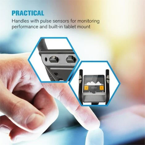 Per combattere la noia avete a disposizione un supporto per tablet integrato nei manici. Qui possono essere posizionati perfettamente smarthphone, tablet o eReader e possono essere utilizzati o per l’app Kinomap o semplicemente per guardare i film ascoltare la musica o leggere durante l’allenamento. Una porta di ricarica USB nel computer per l’allenamento garantisce un training ininterrotto e la connessione bluetooth consente un connessiione senza fili. Chiunque non disponga di uno SmartDevice può monitorare i propri valori di allenamento sull’ Helix Track di CAPITAL SPORTS molto convenzionalemente tramite il computer training integrato. Oltre alla distanza percorsa, al tempo di allenamento e al consumo di calorie, visualizza anche la frequenza cardiaca direttamente grazie ai sensori manuali integrati. Ultimo ma non meno importante, il silenzioso sistema SilentBelt assicura che il vostro allenamento non infastidisca nessuno.