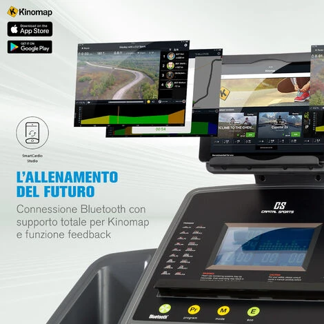 Benvenuto all’allenamento connettivo e multimediale del futuro: grazie al Bluetooth 4.0 il tapis roulant Infinity Track 4.0 di CAPITAL SPORTS viene completamente integrato dall’app Kinomap. Questa non solo fornisce accesso a migliaia di chilometri di percorsi, ma è anche collegata al tapis roulant con il sistema di feedback diretto. Così vengono valutati i dati della prestazione come velocità, frequenza cardiaca e la distanza percorsa e allo stesso tempo viene gestito il livello di pendenza adatto al percorso scelto. Puoi fare jogging attraverso città e foreste, senza dover lasciare il tuo appartamento. Se ciò non dovesse bastare, puoi partecipare a una delle tante esperienze multigiocatore: mettiti alla prova in confronto diretto con altre migliaia di corridori. Ti sentirai come se stessi correndo la maratona di Berlino. Oppure lascia che la community partecipi al tuo percorso personale. Basta filmarsi con la ActionCam, caricare su Kinomap e gli appassionati di fitness da tutto il mondo potranno correre con te.