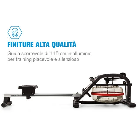 La guida scorrevole d’alluminio da 115 cm del vogatore ad acqua Rowlympic di CAPITAL SPORTS garantisce un allenamento comodo e silenzioso. A un sostegno sicuro ci pensano i poggiapiedi regolabili su 4 livelli. Dopo l’addestramento è possibile riporre facilmente il vogatore. Basta posizionarlo in verticale e non occupa più spazio di una sedia. Grazie alle rotelle lo puoi spostare come preferisci.