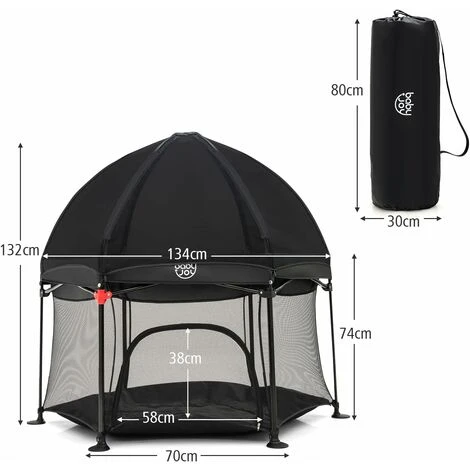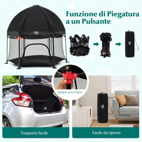 Il nostro box portatile è stato realizzato specialmente per i bambini. Misura 134 x 132 x 132 cm e offre un ampio spazio in cui i bambini potranno sedersi, gattonare, camminare e giocare. Ha il tettuccio rimovibile che allontana le zanzare. Inoltre, è realizzato in tessuto Oxford sicuro e inodore. La rete intorno garantisce la ventilazione e la visibilità. Quando non lo usi più, basta premere il pulsante verso il basso e piegare il box in una dimensione compatta senza che ingombri. Include la borsa portatile per trasportarlo facilmente. Il tappetino con rivestimento in spugna garantisce la massima comodità ai bambini.