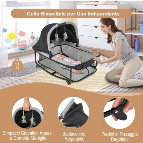 - Culla Utilizzabile Separatamente: Dotata di un tettuccio regolabile e di 2 simpatici giocattoli appesi, il lettino insieme a funzione dondolo permette al bambino di dormire sonni tranquilli. Dotata di conveniente maniglia, questo lettino è perfetto per le uscite.