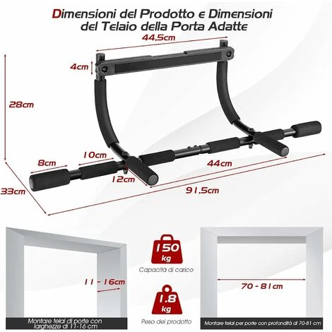 - Si Adatta alla Maggior Parte delle Porte: Questa sbarra per allenare la parte superiore del corpo si adatta a ogni porta sia a casa che nella tua palestra personale, così potrai allenarti comodamente. Ricorda che questa sbarra si adatta alle porte con strutture profonde 11-16 cm e ampie 70-81 cm.