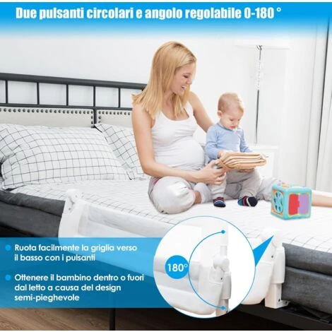 - Design facile da abbassare: Con un pulsante su entrambi i lati, la sponda è facile da abbassare. Si può piegare a metà per far entrare o uscire il bambino dal letto oppure in un determinato angolo per proteggere il bambino mentre dorme.