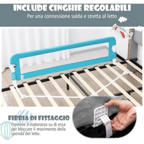 - Cinghie regolabili: La nostra sponda per bambini è dotata di cinghie regolabili per adattarsi a letti di diverse dimensioni. Ogni cinghia è dotata di una fibbia di fissaggio che impedisce alla sponda di muoversi.