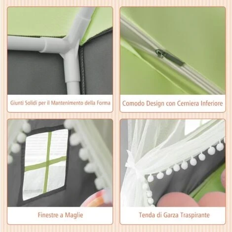 Tenda castello perfetta per i bambini per leggere, giocare e fare un riposino! La nostra tenda crea un ampio spazio privato in cui i bambini possono divertirsi, leggere, giocare, coltivare la loro immaginazione e aumentare la creatività. È tessuta in poliestere misto cotone morbido, antistatico e delicato sulla pelle. Inoltre, i tubi in PVC di alta qualità compongono una struttura solida e resistente così i bambini potranno giocare liberamente senza preoccuparsi che la tenda cada. Inoltre, le 2 finestre a rete sono integrate su entrambi i lati della tenda per garantire una migliore ventilazione. Poi, ci sono tante stelle luminose che aiutano a creare un’atmosfera comoda. Sia che ai tuoi bambini piaccia leggere libri, fare un riposino, fare picnic o feste, sarà la scelta perfetta per loro.
