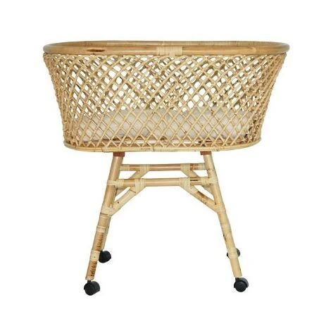 Culla Manao con canne intrecciate. Dotata di comode ruote per poter essere spostata nei punti più comodi e cuscino all’interno