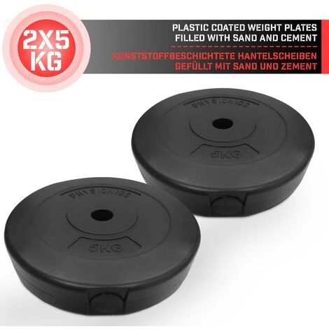 Allenare a casa vi dà la flessibilità di allenarvi quando e come volete. Con questo set di 2 pesi da 5 kg, potete lavorare per i vostri obiettivi di fitness. Il diametro del foro delle piastre misura 27 mm. Il rivestimento di plastica sui dischi protegge il pavimento e fornisce un allenamento silenzioso.