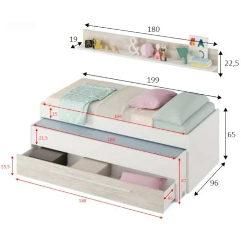 DIMENSIONI IN CM – Letto superiore: Lunghezza: 199 Larghezza: 96 Altezza: 65 – Letto inferiore: Lunghezza: 188 Larghezza: 96 Altezza: 47 – Capacità cassetto: 188x45h16,5 – Mensola: 180x19h22,5