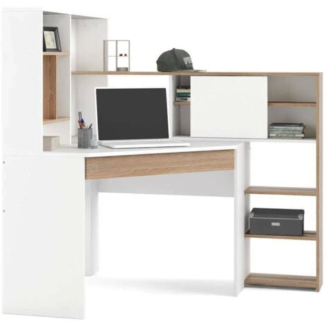 Scrivania strutturata ad angolo con ripiani e un cassettone sotto al piano d’appoggio ideale sia per l’ufficio che per un ufficio casalingo.