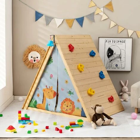 - È possibile collocare la casetta in salotto, nella stanza dei bambini e persino in giardino per far trascorrere ai vostri piccoli ore di divertimento. Offre un ampio spazio privato, dove è possibile giocare, leggere e riposare. La parete da arrampicata permette ai bambini di salire in cima, ottenendo un senso di realizzazione e di miglioramento delle abilità motorie. La robusta portata di 30kg e la struttura triangolare ultra-stabile creano un ambiente di gioco sicuro. Inoltre, il legno di abete massiccio con superficie verniciata impermeabile e liscia ne garantisce la durata e aumenta la sicurezza. Le tende impermeabili fissate con ganci e passanti sono comode da rimuovere e lavare.