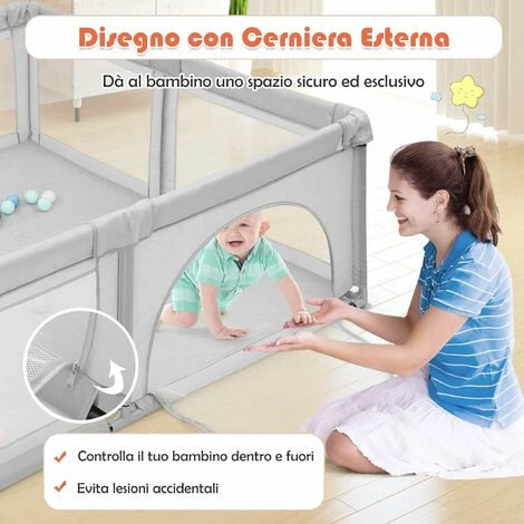 - Stai cercando un recinto di sicurezza per il tuo bambino? Questo box rettangolare sarà una scelta ideale per te. È realizzato in struttura di acciaio verniciato robusta. I connettori sono solidi e resistenti per una maggior stabilità e con i piedini a ventosa si fissano bene sul pavimento per l’utilizzo sicuro. Ci sono 2 portine ad arco in rete traspirante e sono anche facili da aprire e chiudere dall’esterno con la cerniera flessibile. Offre un centro di attività ai bambini per giocare dalla nascita. Grazie al design leggero, è facile da spostare. Compralo subito!