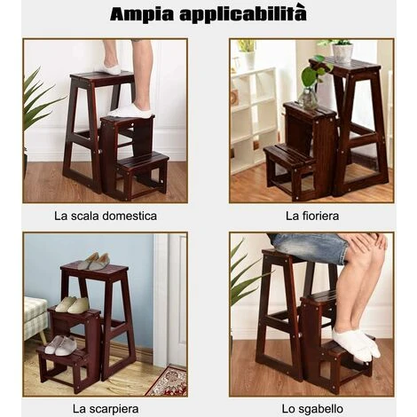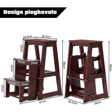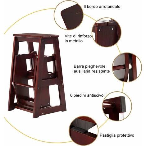 | PUNTI DI FORZA: Può essere trasformato in uno sgabello Piedini in gomma antiscivolo Ampie pedane antiscivolo Solido e stabile Salvaspazio, occupa poco spazio Adatto ad uso domestico | SPECIFICHE: Colore: Marrone scuro/Marrone chiaro Materiale: legno di pino Dimensione: 57 x 38 x 65 cm Peso netto: Ca. 5,2 kg Capacità di carico del sedile: 150 kg Capacità di carico della scala: 130 kg | CONFEZIONE: 1 x Sgabello scaletta 1 x Manuale |