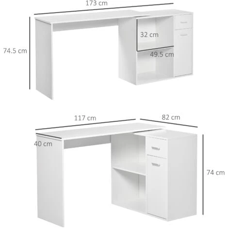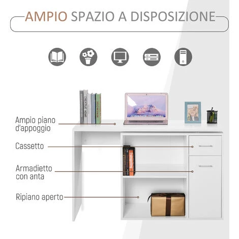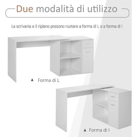 Cambia la disposizione della tua postazione di lavoro, in un attimo! Come? Con questa scrivania angolare HOMCOM. La struttura è costruita in pannelli truciolari con superficie in melammina: antigraffio e facile da pulire. Il piano di lavoro e lo scaffale inferiore si possono ruotare di 360° per trovare la posizione più comoda.Questa scrivania può essere utilizzata anche come tavolo da pranzo.