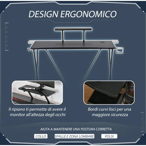 Per avere postazione gaming ben progettata hai bisogno di una scrivania porta PC che sia all’altezza delle tue esigenze. Proprio come questo modello HOMCOM. Il telaio in metallo ti assicura stabilità e robustezza, mentre il piano d’appoggio è così ampio da poter sistemare comodamente monitor, tastera e mouse. In più, grazie al gancio per le cuffie, al porta bicchieri, al foro passacavi e ai supporti per le casse, ti offre tutto il necessario per allestire la tua postazione in modo davvero professionale.