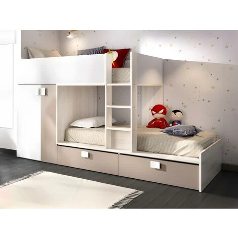 Liberare lo spazio nella camera dei tuoi bambini è possibile con il letto a castello JUANITO. La sua armadio e i 2 grandi cassetti ti permettono di sistemare tutti i loro oggetti.