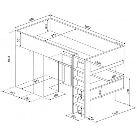 Letto a soppalco Kyle per un bambino Nero grafite Bianco opaco e Rovere con armadio e scrivania