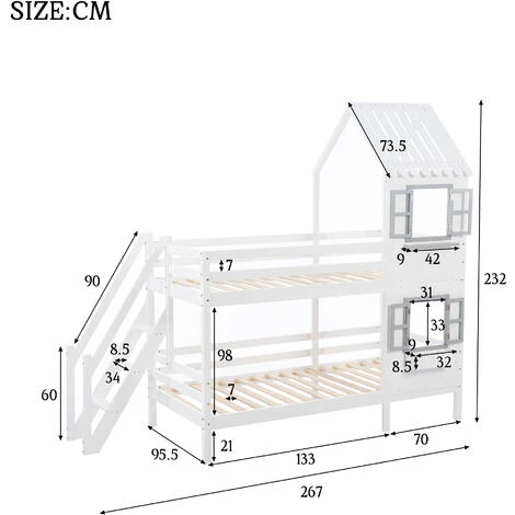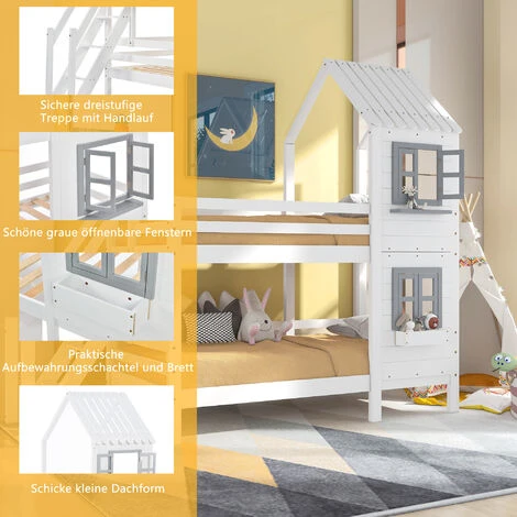 Recinzioni sicure e strette e binari delle finestre su tutti e quattro i lati della cuccetta superiore mantengono i bambini al sicuro e prevengono le cadute. La scala laterale a tre piani ha corrimano e il bordo della scala è robusto e spesso.