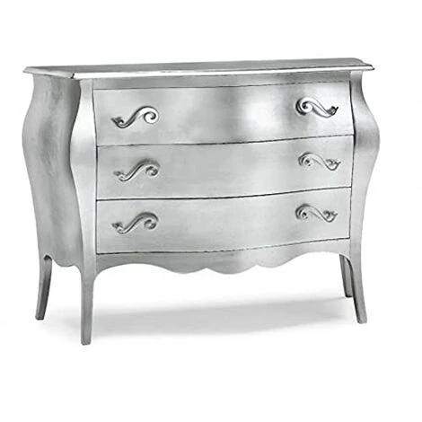 Stile: Comò bombato in arte povera con 3 cassetti. Una soluzione ideale per tenere in ordine vestiti e oggetti personali. La superficie ampia e luminosa potrà accogliere i tuoi soprammobili e darà uno stile classico e curato all’ambiente – Colorazione: Argento – Materiale di costruzione: Struttura in legno di Pioppo – Misura: 100x42x85h – Mar.c.a. Design: Arredi e Design di alta qualità, con esperienza ed assistenza post vendita