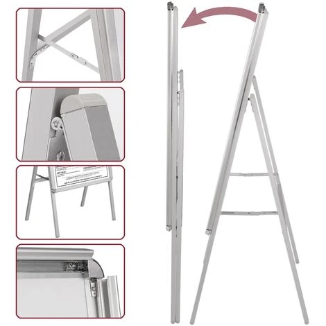 - CARATTERISTICHE: Efficiente cavalletto pieghevole che si auto sostiene e mostra la pubblicità su un lato. Profili laterali con apertura e serratura per l’inserimento, l’estrazione e il cambio dei manifesti. Ha un foglio frontale trasparente per proteggere in ogni momento la pubblicità, il poster, il menu, ecc.