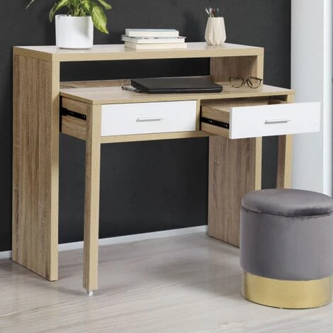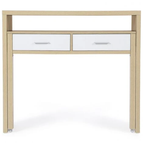 Questa scrivania è perfetta in salotto o in camera da letto e si adatta a qualsiasi ambiente: soggiorno, camera dei bambini, camera degli ospiti, corridoio, pianerottolo.I 2 cassetti scorrevoli bianchi di questa scrivania allungabile contemporanea vi permetteranno di riporre e organizzare i vostri oggetti personali (documenti, forniture) in totale discrezione e di lavorare al computer comodamente su due livelli con il ripiano della scrivania e la parte superiore della console sollevata.Multifunzionale, può essere utilizzato anche come toletta, ideale per comode sessioni di make-up, i due vani portaoggetti sono progettati per contenere i vostri accessori.Può essere utilizzato anche come consolle per valorizzare qualsiasi ambiente della casa e fare spazio agli ospiti!Le 2 posizioni lo rendono un mobile salvaspazio ideale per i piccoli spazi!Sarà perfetto per un piccolo ufficio o per un ufficio domestico.La scrivania è realizzata in truciolato (spessore 1,5 cm).Dimensioni della scrivania allungabile: legno di faggio e bianco :Dimensioni complessive (console chiusa): Lunghezza 98,5 cm x larghezza 36 cm x altezza 88 cm Dimensioni ripiegate (scrivania aperta): Lunghezza 98,5 cm x Larghezza 64 cm x Altezza 88 cmDimensioni della sola scrivania: Lunghezza 91,5 cm x Larghezza 34 cm x Altezza 73 cmDimensioni del cassetto : Lunghezza 36 cm x profondità 27 cm x altezza 7,5 cmModello disponibile in diversi colori nel nostro negozio online:- Scrivania allungabile in legno bianco – Scrivania allungabile in legno bianco e faggio
