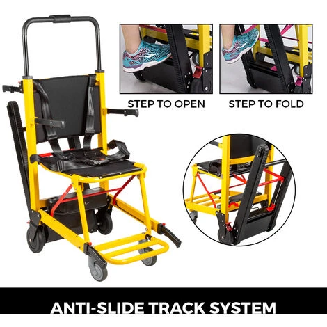 Un passo per piegare / aprire questa sedia per scale. Realizzata in eccellente lega di alluminio, la sedia per scale di evacuazione è leggera e robusta. Può essere collocato nel bagagliaio o in ambulanza, occupa solo poco spazio.