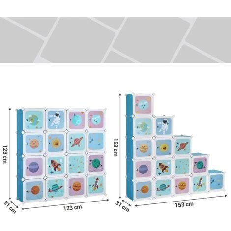 Songmics Scaffale Portaoggetti A 16 Cubi Per Bambini, Portagiochi Ad Incastro, Armadio In Plastica, Organizzatore Modulare Per Abiti Scarpe Zainetto, 123 X 31 X 123 Cm, Azzurro