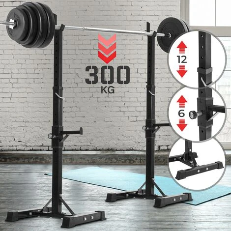 Il nostro robusto e stabile supporto per bilancieri è ideale per la vostra piccola palestra da casa! In combinazione con una panca pesi (non inclusa) è perfettamente adatto per allenamenti con bilanciere o per i squat.