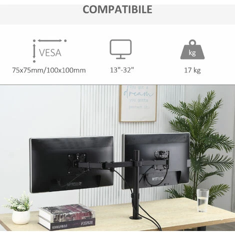 Rendi la tua postazione di lavoro più ergonomica con il supporto monitor doppio Vinsetto. Facile da posizionare sul piano della scrivania grazie al morsetto, ti permette di avere i monitor all’altezza degli occhi e mantenere la postura giusta per lavorare. Trova la posizione perfetta per ogni esigenza: ruota i monitor in orizzontale e verticale e regola l’inclinazione. Lavorare al meglio è facile con la nostra staffa per monitor!