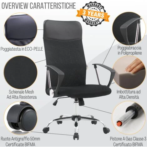 Poltrona da ufficio elegante ed ergonomica realizzata in tessuto traforato traspirante con altri dettagli in ecopelle. Questa sedia presidenziale è ideale per l’ufficio, per lo studio o per la casa. E’ dotata di un pistone a gas in acciaio cromato che permette di regolarne l’altezza tramite leva. Il tessuto perfettamente rifinito di questa sedia da ufficio nera, risulta morbida al tatto, resistente all’usura, di facile pulizia e soprattutto traspirante. Comodissima, ergonomica ed avvolgente, risulterà un vero piacere lavorare al pc, in ufficio o in casa senza accusare, a fine giornata, fastidiosi dolori alla schiena. Il supporto lombare permetterà di assumere una postare corretta durante il tempo di utilizzo della poltrona. Direzionale e girevole, dunque rotante a 360° grazie alla piedistallo cromato con 5 ruote ideali per tappeti e superfici morbide.